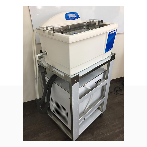 For processing thermally labile compound in Ultrasonic bath we can provide special chiller arrangement for bath having nominal volume of 20 ltr. There will be chiller with special arrangements to chill the bath media operate around 20 - 25 Deg C. We can also provide suitable trolley to carry bath at working height with chiller mounted below as one whole module which has wheels to make it movable within laboratory. We can also provide height adjustable tray with assorted lotus clamps to hold volumetric flasks of various sizes from 5 ml to 100 ml volume range so that they do not topple in ultrasonic bath.